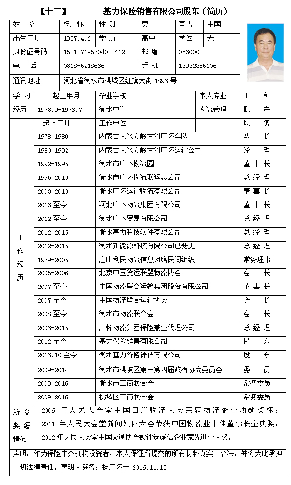 【二】基力保险销售有限公司股东杨广怀:自1998年组建担任物流社团民间组织负责人与物流协会会长后,为了保障物流协会的会员单位连锁加盟联合式运输亊业持续发展,排除会员单位在联合式运输途中发生交通亊故后导致货物损失纠纷隐患,杨广怀会长为攻关转嫁会员单位的货运风险,2003年注资建立了“货运险”研发团队,专职研发设计“货运险”条款,成功的开发研究设计出一系列科学先进合理适用的物流保险产品。股东杨广怀注册从亊管理保险兼业公司专业经营“货运险” 十年,股权转让兼并基力保险销售有限公司,晋级全国性保险专业中介机构,始终对研究货运险及物流保险产品不离不弃,亲历亲为的跟踪研究设计开发物流保险产品,股东杨广怀对物流风险预测、预防、管控、价格评估、货物施救、现场勘查、定损、理算、理赔、物流保险的道德风险防范措施等都进行深层次的调研与分析,制定了切实可行的管控措施, 2005年研究设计推出国内公路物流货物运输保险条款,把原货物运输保险费率千分之三降低至万分之零点一以下,大幅度降低了国内公路物流运输保险成本。2007年建立了科学先进合理适用的互联网+www.e56365.com物流信息公共平台。2015年延伸建立了无资费、无任何符加条件的手机版电脑端“货运通”互联网+“电商物流与电商保险国际现代物流信息超市公共平台,为物流货运信息市场设立”零距离OTO线上线下无缝链接门到门服务体系。
