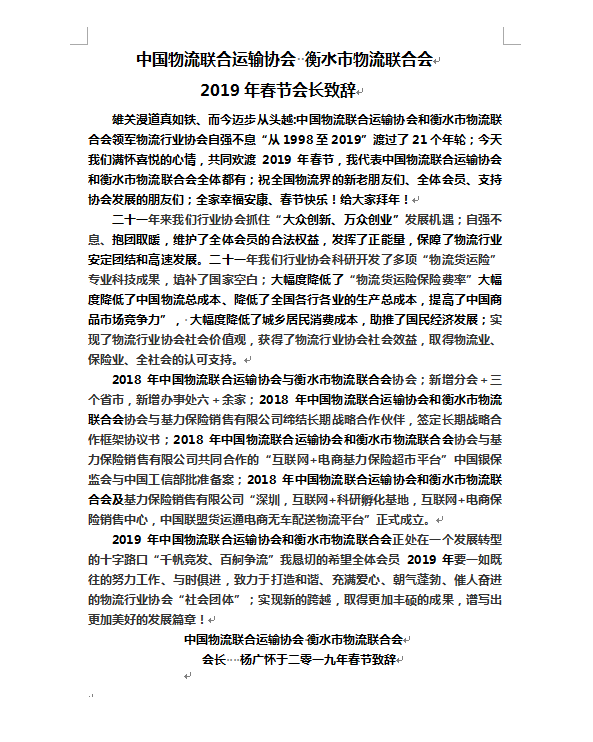 中国物流联合运输协会2019春节致辞